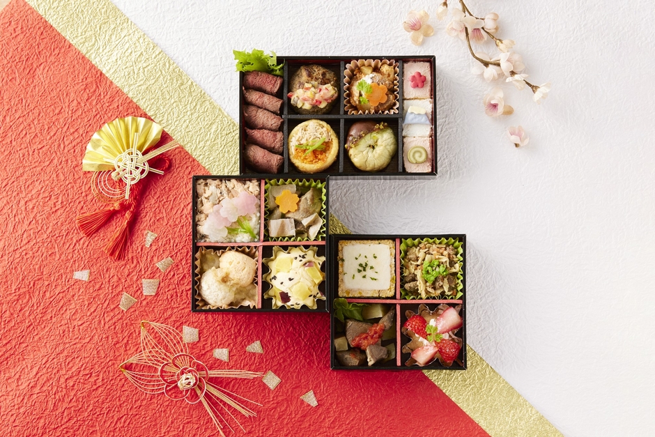 お正月の定番であるお雑煮をイメージした鶏肉のお肉料理などを絵馬に見立てたお重に詰めました。