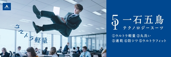新CMでは今回の軽量スーツを着用したビジネスマンたちが、ふわふわと浮遊しながら仕事する様子を描き、商品の軽さをユニークな映像で表現しました。また、このスーツを「ウルトラ軽量」・「丸洗い」・「速乾」・「防シワ」・「ウルトラフィット」の5つの機能を備える“一石五鳥テクノロジースーツ”として訴求しています。CMはTV向けの15 秒VerとWEB 限定の33秒Verを用意しています。