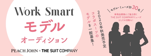 青山商事株式会社(本社:広島県福山市/代表取締役社長 青山 理)は、株式会社ピーチ・ジョン(本社:東京都港区/代表取締役社長 杤尾 学)と、働く女性用のセットアップスーツを共同企画し「ザ・スーツカンパニー」及び、「ホワイト ザ・スーツカンパニー」で10月1日(木)より販売します。これに先行して、今回の共同企画スーツの様々なプロモーションに起用するモデルを、一般女性の中から募集します。募集については、8月7日(金)から19日(水)の期間で、特設キャンペーンサイト(https://bit.ly/33vziYl)で実施します。
