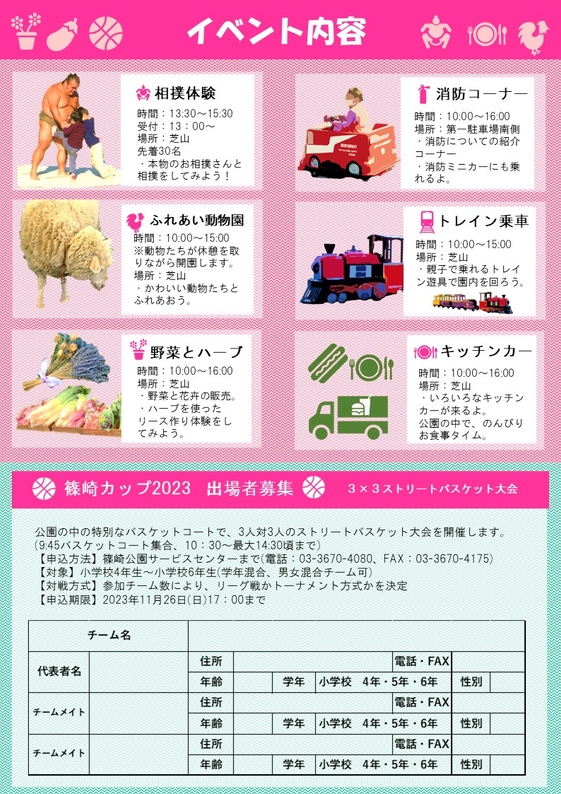 「篠崎カップ2023」開催決定!公園内のバスケットコートで、3人対3人のストリートバスケット大会を行います。篠崎カップでは現在小学4年生~6年生の参加者を大募集中です!必ず『3人1チーム』でお申込みください。