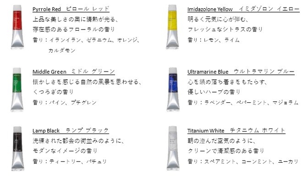 「香るアクリル絵具」は100%天然アロマで香りづけしたアクリル絵具です。絵具の色は、ピロール レッド、イミダゾロン イエロー、ミドル グリーン、ウルトラマリン ブルー、ランプ ブラック、チタニウム ホワイトの6色あり、それぞれの色をイメージしてブレンドされた香りを感じることができます。