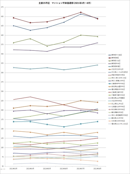 ■主要25市区 坪単価遷移(2021年3月~8月)