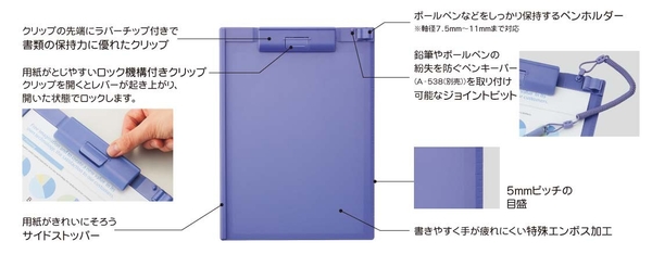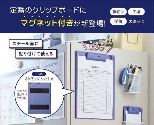株式会社LIHIT LAB.(本社:大阪市中央区農人橋1-1-22 代表取締役社長:田中宏和)ではこの度、発売後約20年を迎えるロングセラー商品であるクリップボード(A-977U)の仕様はそのままに、本体裏面にマグネットを貼り付けた新製品「クリップボード<マグネット付>」を2月下旬より発売します。クリップが開いた状態で止まるので用紙がとじやすいロック機構付きクリップボードの裏面2箇所にマグネットシートをつけることで、工場や倉庫などの「現場」で扉や機械などのスチール面に貼り付けられる商品です。もちろん、吊り下げ穴もあるのでフックに吊り下げて使用することも可能です。全国の文具小売店・量販店の文具コーナーおよびオンラインストアなどで発売します。