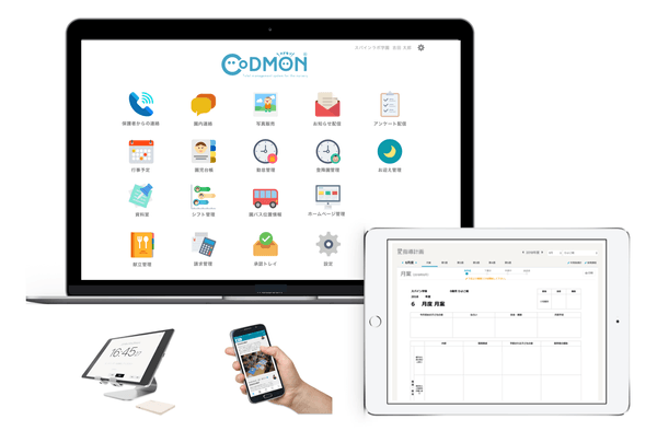 「CoDMON」は園長や保育士の日々の業務負担軽減を目的とした、子育て施設業務支援システムです。ICT化によって指導案や日誌の作成、園児毎の登降園管理や保育料計算、請求管理、さらには保護者連絡まで、一貫してサポートしています。