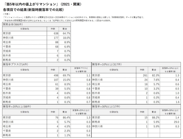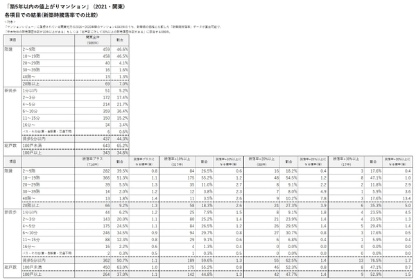 ■「築5年以内の値上がりマンション」(2021・関東) 各項目の結果(騰落率での比較)
