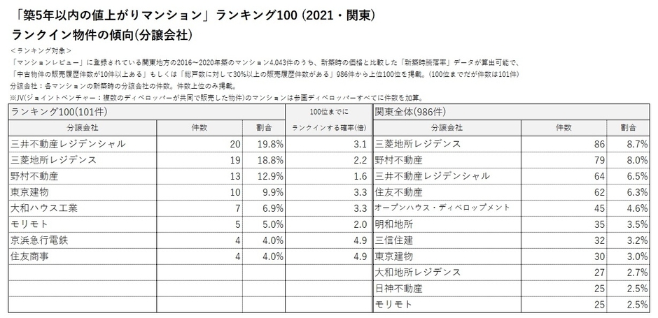 ・100位までの分譲会社*2は「三井不動産レジデンシャル」が20件でトップ。以下、「三菱地所レジデンス」19件、「野村不動産」と13件と、資本金が10億円を超える大手ディベロッパーが多く占めた。