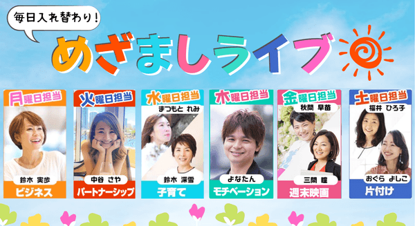 「めざチア」は、弊社代表の鈴木が主宰する、どこよりもポジティブな朝のオンラインサロンです。毎朝8時から日替わりで、「ビジネス」「美容」「子育て」「家事」「エンタメ」など、さまざまな分野のライブ配信をお届けしています。