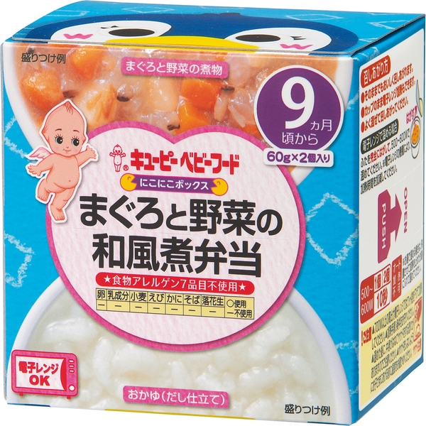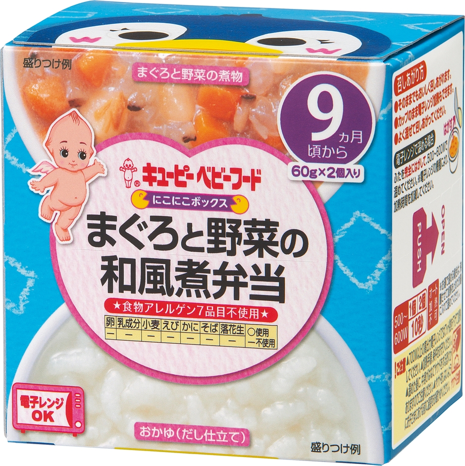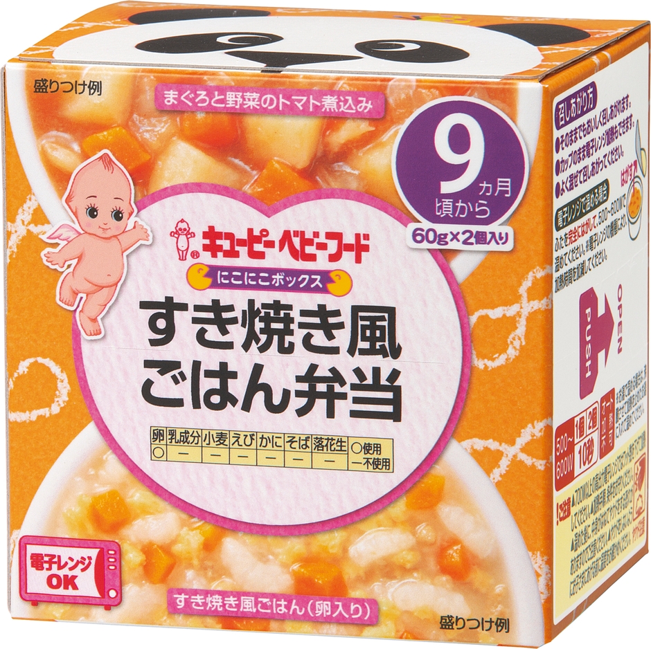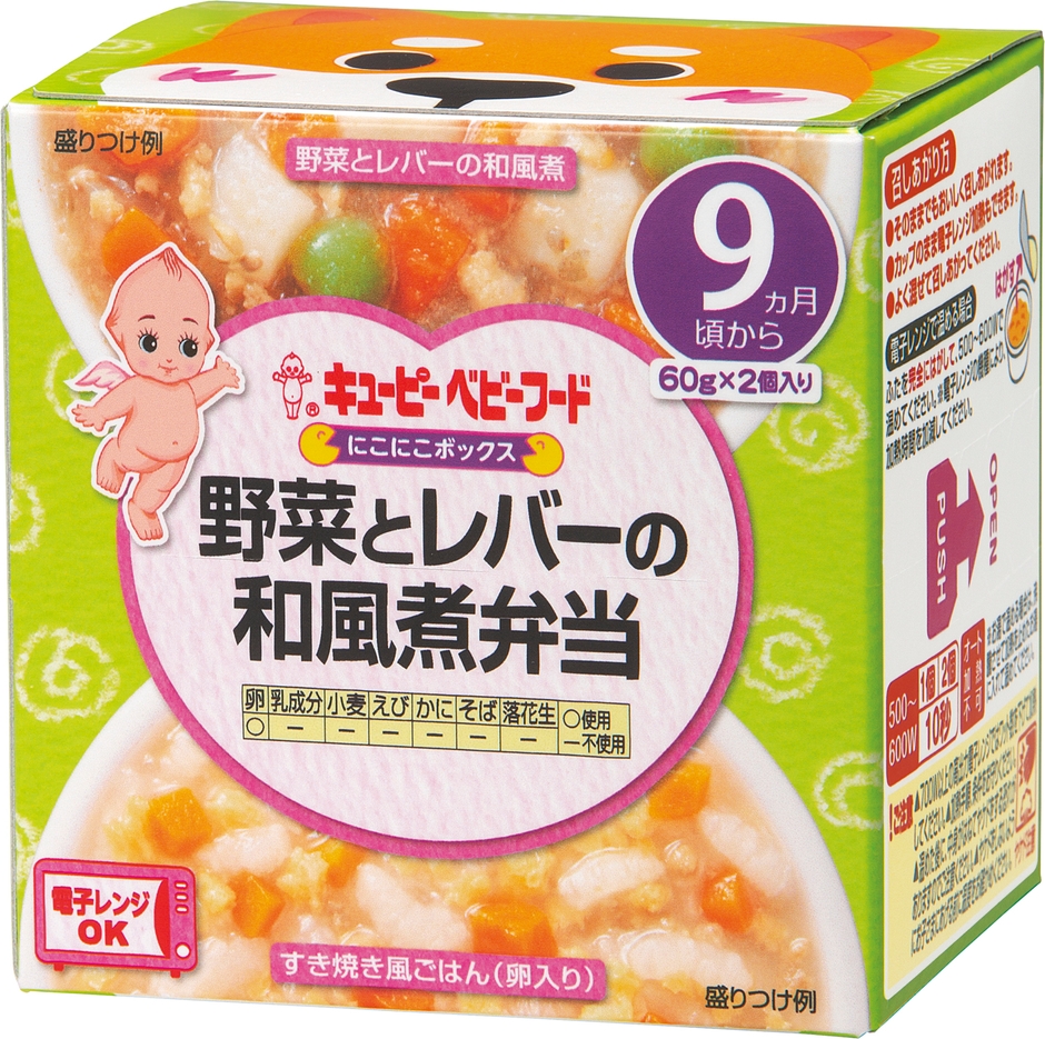 「にこにこボックス」シリーズは、レトルトカップ入りの主食とおかずが、1箱に1個ずつ入ったベビーフードです。電子レンジ加熱可能な容器のため、温める場合も皿に移す必要がなく、後片付けが簡単です。また、温めずにそのままでも食べられるので、外出時などにも便利です。
