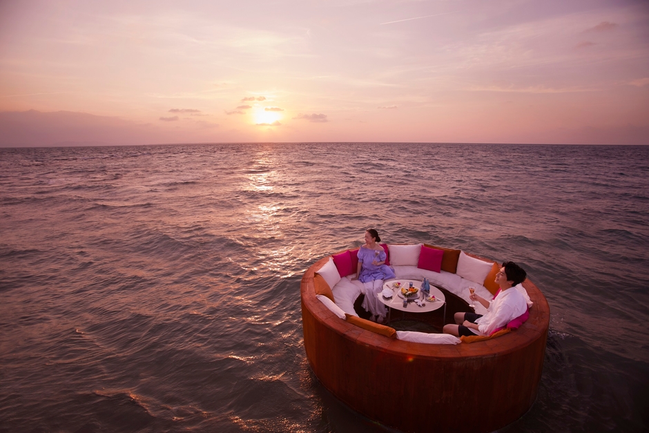 ビーチでも、贅沢な時間を満喫できます。水平線に上る朝陽から満天の星空まで刻々と表情を変えていく空や、海の景色を眺めながら、優雅な時間を過ごすことができます。早朝には、静かな海を独占できる「朝焼け海上ラウンジ」が浮かびます。また、シュノーケリングやダイビングなど、海の魅力を満喫するマリンアクティビティも用意しています。