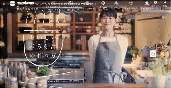 サイトにアクセスすると、ほぼ全画面でおみそ汁の作り方の動画が流れるマルコメの特設ページです。マルコメの味噌そのものだけにフォーカスせず、「おいしいお味噌汁をつくるには?」というお味噌汁づくりの方法伝授や、味噌汁の知識を広めることに重点がおかれたページ内容です。