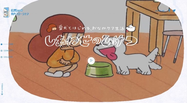 トップ動画以外の製品名や各タイトル文字、製品の特長なども全てウィスット・ポンニミット氏のイラストやアニメーションで表現され、とてもわかりやすく可愛らしい仕上がりに。アニメーション動画をメインに据えた特設ページは、その絵柄のキュートさもあいまって、愛犬への思いやりや愛犬との絆、和みの印象を与えることに成功していると言えるのではないでしょうか。
