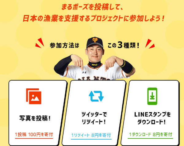 アンバサダーに、プロ野球・読売ジャイアンツの丸佳浩選手が就任し、丸選手をモチーフとしたオリジナルLINEスタンプの配信(先着50,000ダウンロードまで)や、一般の皆様から丸選手のトレードマーク「まるポーズ」の写真などを投稿いただくキャンペーンなどを実施。各SNS上でのキャンペーン参加数に応じて資金を積み立て、日本の食文化を支える漁業の発展のため、資金や物資等の寄付を予定しております。