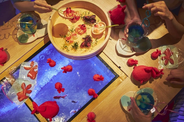 江戸時代、モナカの皮に針金で持ち手を付けた道具「ポイ」を使用して金魚すくいをしていました。スイーツの皿をその道具にみたて、餡やいちごで作られた金魚をすくい、食べることができます。他にも金魚型のクッキーやカクテルを提供します。