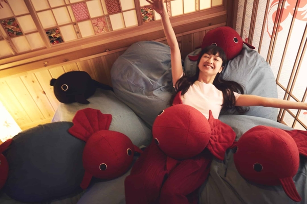 スイーツを食べ、語らいを楽しんだ後は、金魚クッションを使って遊ぶこともできます。例えば、制限時間内に積み上げたクッションの数で運勢を占う「金魚みくじ」ができます。また、水を表現したクッションを使い、水の中で金魚と自分が一緒にいるような写真撮影ができます。