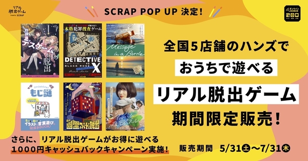 全世界で累計1,490万人以上を動員しているリアル脱出ゲームを企画制作する株式会社SCRAP(本社:東京都渋谷区、代表:加藤隆生)は、2025年5月31日(土)~7月31日(木)の期間限定で、全国5店舗のハンズにてポップアップショップを開催いたします。