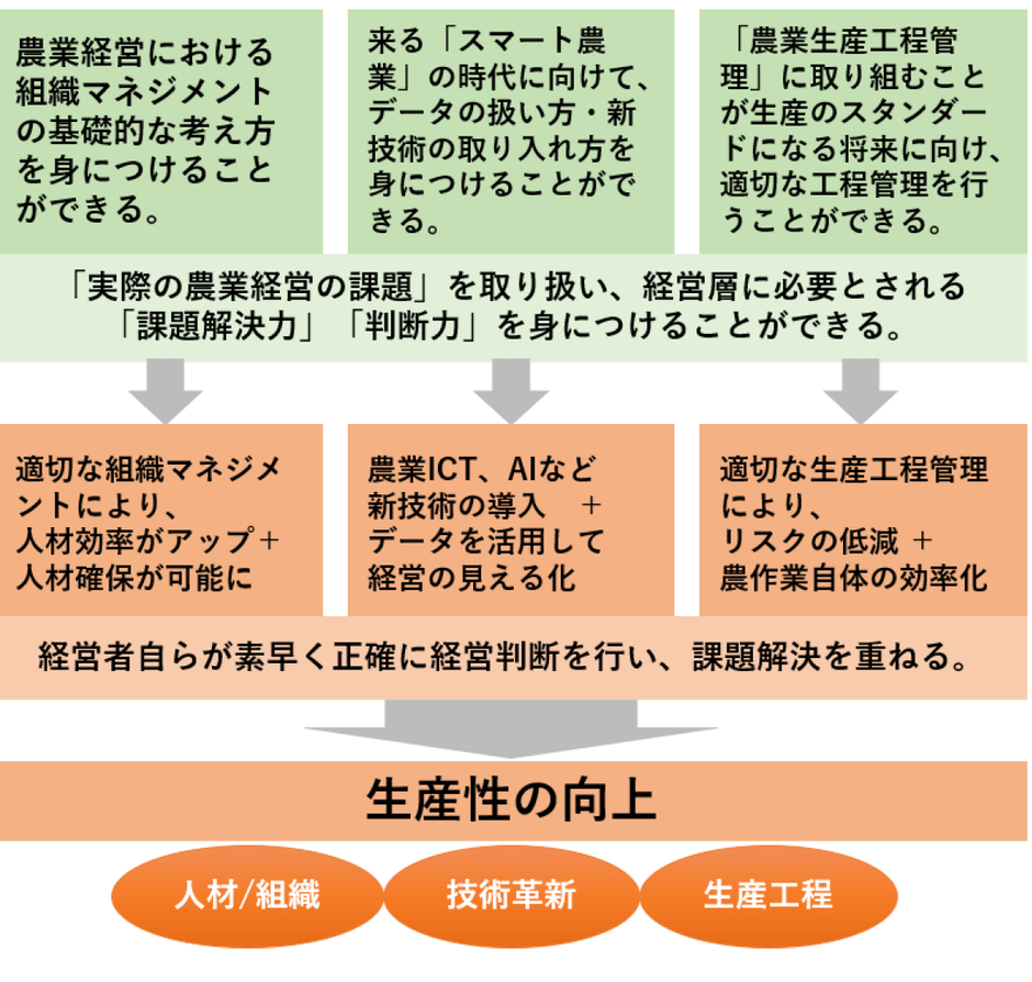 農業経営における組織マネジメント(経営戦略・人材活用・労務・管理会計)、データマネジメント・ICT / IoT、生産工程管理などの知識を深めるほか、先行者の成功・失敗を含めた経営ノウハウを習得するため、自身の経営課題と密接に関わるテーマを題材に、「リアル」ケーススタディを紹介。