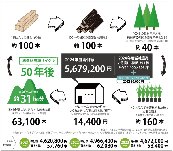 株式会社ゼロ・コーポレーション(本社:京都市中京区、社長:菊本雅幸、以下「ゼロホーム」)は、宮崎県のスギ植林・育林を目的とする再造林支援2024年度分として、約567万円の寄付金の贈呈を2024年12月に行いました。この寄付は、ゼロホームが独自で進める「苗木を還そうプロジェクト(以下、「苗木プロジェクト」)」の一環として2021年にスタートし、今回で4回目です。同プロジェクトにおけるこれまでの寄付金合計は、約1993万円となりました。