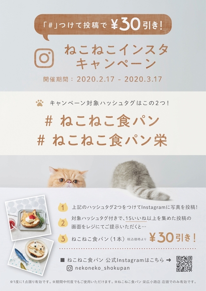 ご自身のインスタグラムに下記の2つのハッシュタグを付けて「ねこねこ食パン」を投稿していただき、「♥15いいね」をゲットすると、ねこねこ食パン1斤が30円引き!