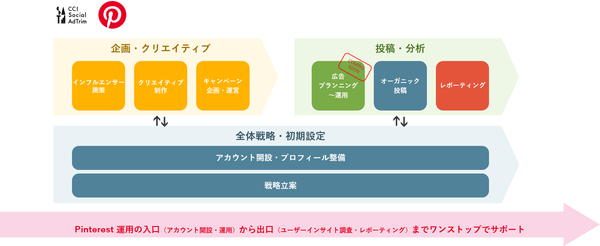 CCI はこれまでTwitter、Facebook、Instagram、LINE、TikTok といったプラットフォームを活用した様々なマーケティング施策を支援してきました。“CCI Social AdTrim for Pinterest” では、様々なプラットフォームの運用支援で得たノウハウと、Pinterest の特性を踏まえて、Pinterest ビジネスアカウントの開設~運用・レポーティングまでの施策をワンストップで提供し、Pinterest ビジネスアカウントを通じた企業とユーザー間の最適なコミュニケーションを実現します。
