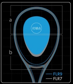打球するフレーム上部は90平方インチ同等のスウィートエリアを維持しつつ(a)、フレーム下部は大幅にスリム化(b)し、90平方インチの反発と85平方インチの操作性を両立。