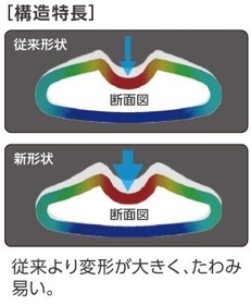 変形が大きくたわみやすい新断面形状が打球衝撃を軽減し、扱いやすいマイルドな打球感を生み出します。