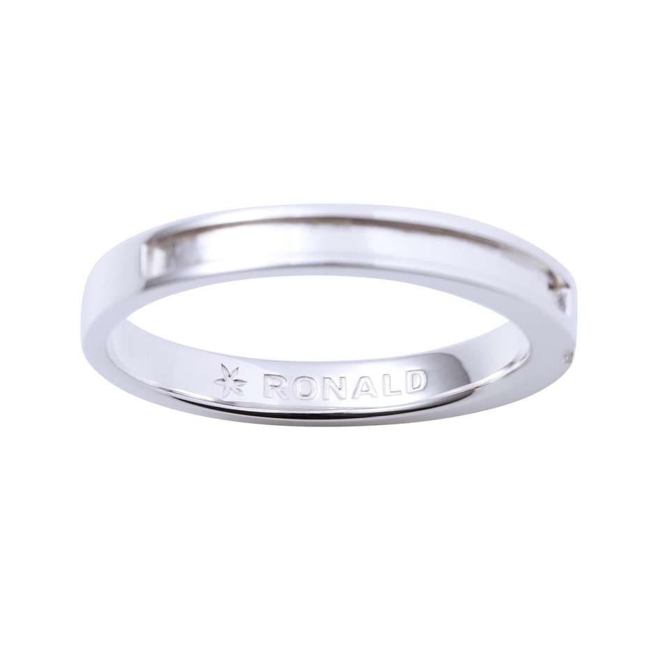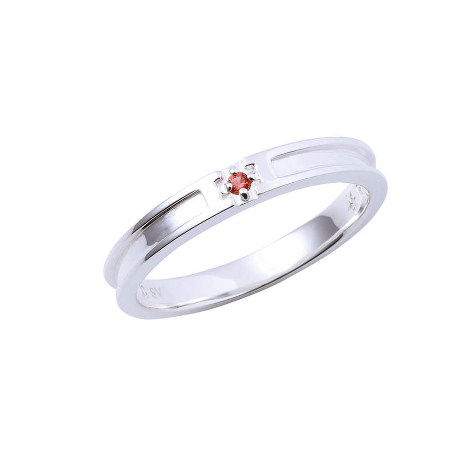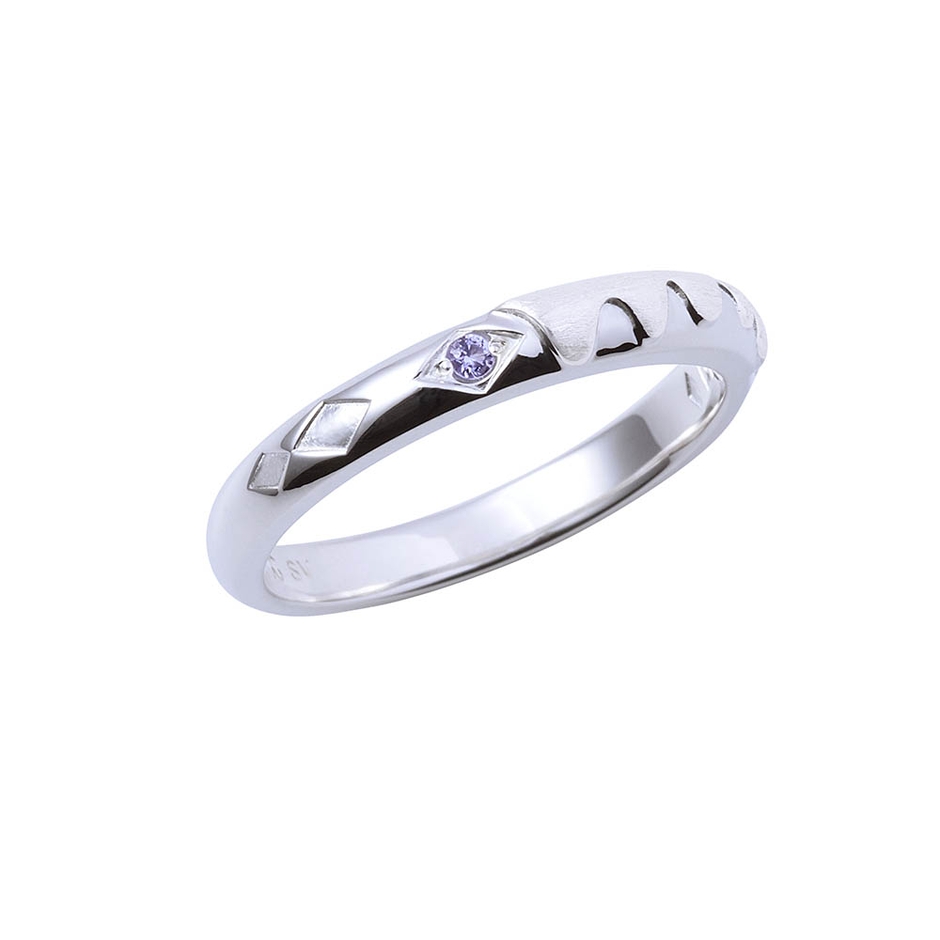 平打ちフォルムの中央にはのコスチュームの飾りと、イメージカラーストーンをセットしました。内側には名前とアイコンを刻印した、作品の世界観が感じられるデザインです。