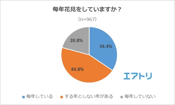 「毎年している」が34.4%、「する年としない年がある」が44.8%となり、お花見がいかに日本人に慣れ親しまれた行事かが窺える結果となりました。