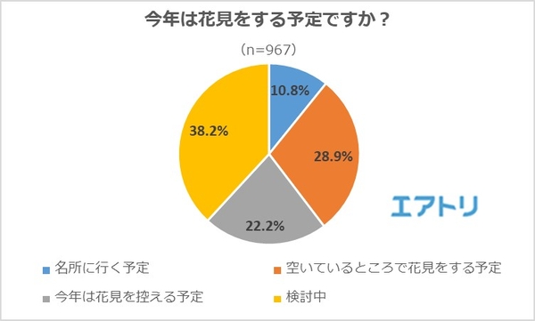 ―「空いているところで花見をする予定」は28.9%、「今年は花見を控える予定」は22.2%となり、「名所に行く予定」は1割に留まりました。
