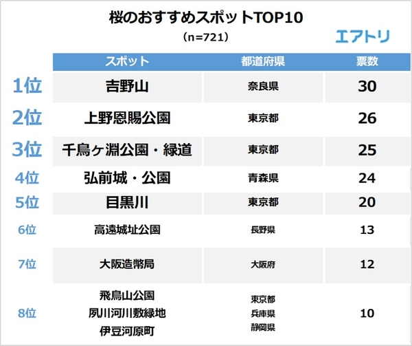 1位は奈良県の「吉野山」、2位以降は「上野恩賜公園」(東京都)、「千鳥ヶ淵公園・緑道」(東京都)、「弘前城」(青森県)と続きました。