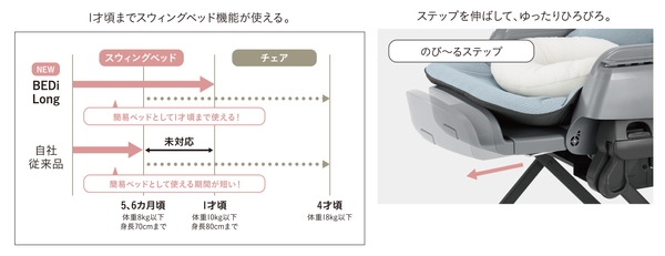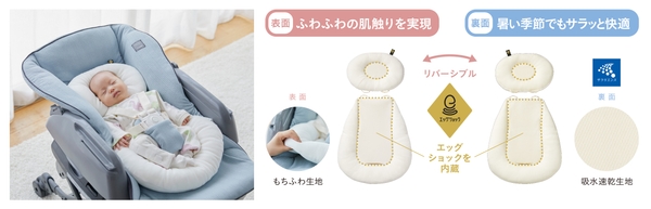 本製品は、従来、使用期間が生後6カ月頃までだったスウィングベッド機能が、電動性能のパワーアップと新機能「のび~るステップ」により、1才頃まで使用可能となりました。ママの心拍数に近いスウィング周期で自動的に揺れる「オートスウィング機能」搭載で、赤ちゃんの寝かしつけをサポートします。また、赤ちゃんが眠りやすい暗さをつくれる大型幌「スリープシェル」や、リバーシブル仕様でオールシーズン快適な「ダッコシートプレミアム」で赤ちゃんの睡眠環境にもこだわりました。