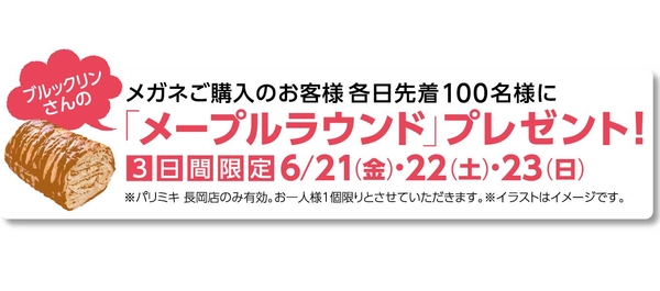 リニューアルオープン3日間限定イベントとして、地元のパン屋さん「ブルックリン」の人気商品「メープルラウンド」を、メガネご購入のお客様、各日先着100名様にプレゼントいたします。