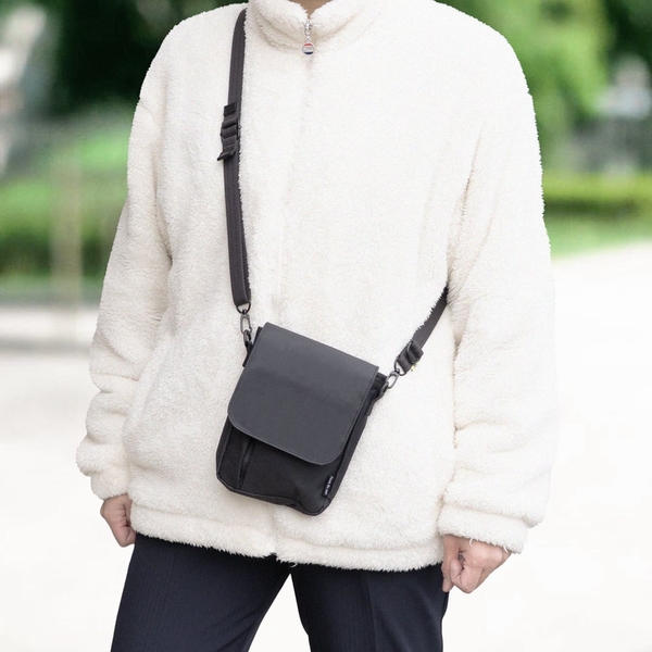 約74cm〜約135cmまで長さが調整できる(ストラップ本体のみ)ため、かさばるアウターの上からの着脱も可能です。
