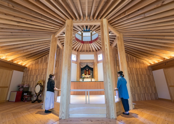 奥の院は、延暦10年(791年)に18才の空海が修業をした所といわれ、2015年には「護摩堂」が再建されました。堂内は、杉木の立派な柱や、中心から傘のように放射状に広がる天井が特徴で、爽やかな風がいきわたる空間です。