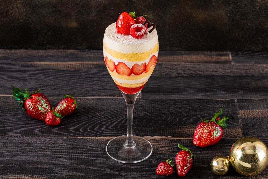 伊豆産いちごピューレの赤と、ボトルに詰めた自家製静岡抹茶シロップの緑でクリスマスカラーを演出。自分好みの味にカスタマイズしながら色の変化をお楽しみいただけます。デザート感覚でお召し上がりいただけるノンアルコールカクテルは、お子様にもおすすめです。