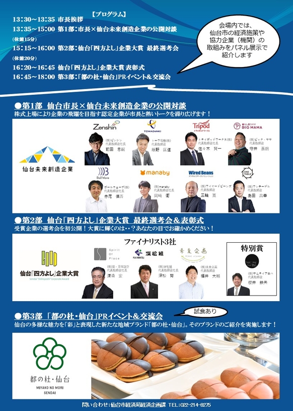 当日は、地域経済を支えている中小企業が登壇し、それぞれの成長に光をあてながら、仙台の未来が感じられるイベントとなる。