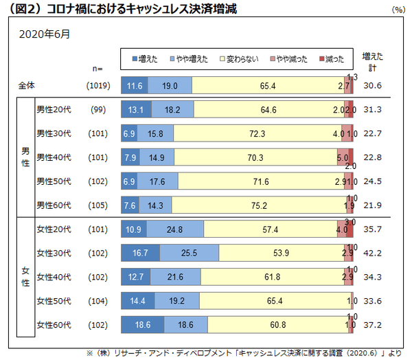 新型コロナウイルスの影響によりキャッシュレス決済が「増えた/やや増えた」と回答した人は30.6%。男性より女性の方が“増えた”と回答した人が多く、特に女性30代と60代で“増えた”とする割合が高い。キャッシュレス決済が増えた理由では「現金を触りたくない」「外出自粛によりネットでの買い物が増えた」など、新型コロナウイルス感染症の影響がうかがえる。