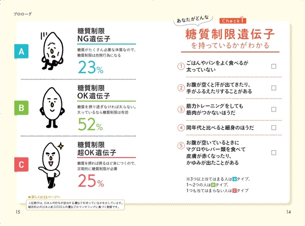 「糖質制限遺伝子とは、体の中に摂り込んだ糖質をエネルギーに変える働きを指示する遺伝子です。私たちの体は、車がガソリンなどの燃料がないと動かないように、エネルギー源となる栄養素を摂り込まなければ生きていくことはできません。糖質は体にとって主要なエネルギー源のひとつです。遺伝子のタイプによって、燃費がいい人もいれば、悪い人もいます。もしも、あなたが燃費の悪い遺伝子ならば糖質を適度に補給しないと、あっという間にガス欠を起こしてしまいます」と語るのは、『めんどうな遺伝子検査をしなくても 自分の遺伝子がわかる本』(アスコム)の著者で遺伝子カウンセラーの植前和之さんです。