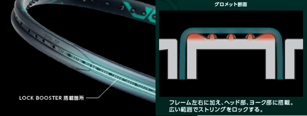 さらに、本製品独自の新スペックとして、フレームの側面厚を標準品に対し2mm厚くしたことに加え、筒の穴が通常より大きいグロメット(ストリングの穴を保護するパーツ)をフレームトップ~サイド部に搭載することで、ストリングの可動域を増大させ、パワーとホールド性を両立しました。