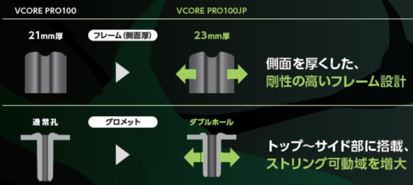 フレームの側面厚を23mmとし(VCORE PRO 100は21mm)剛性を高め、パワフルなショットを実現。また、筒の穴が通常より大きいグロメット(ストリングの穴を保護するパーツ)をフレームトップ~サイド部に搭載し、ストリングの可動域を増大させ、ホールド性を向上させました。