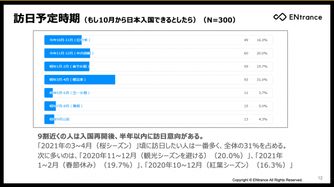 「仮に2020年10月より日本に入国できる場合、いつ頃に訪日したいか」という質問に対し、「半年以内に訪日意向がある」との回答が9割以上を占めました。なかでも桜シーズンでもある「2021年の3~4月」頃との回答が最も多く31%となりました。