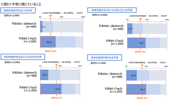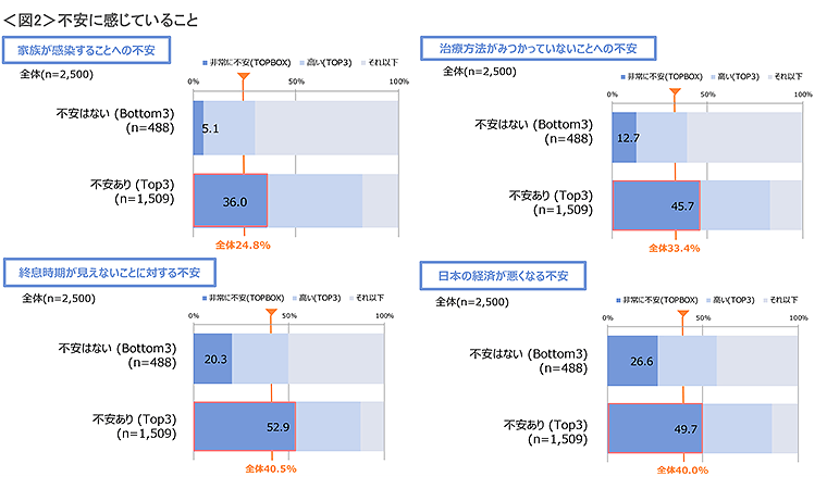 また、【不安に感じること】については、特に、「家族が感染すること」「治療法が見つかっていないこと」「終息時期が見えないこと」「日本の経済が悪くなること」に対しての不安が高かった。 <図2>