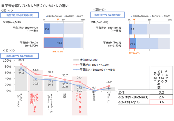 【コロナ渦で不安を感じている人と感じていない人の違い】として、不安を感じている人は、不安を感じていない人と比べて、新型コロナウイルス関連ニュースへの関心度が高く、チェックしているメディアの数が多いことが判明。特に、メディアの中でも「ワイドショーなどの情報番組」・「口コミ」への情報接触が高い傾向がみられた。 <図1-1,3>