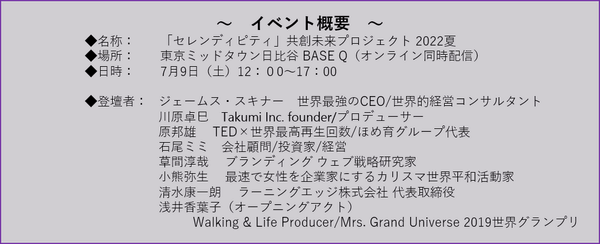 2022年7月9日(土)12:00~17:00 東京ミッドタウン日比谷 BASE Qにて、女性起業家や開業を目指す女性を応援するセミナーイベント、「セレンディピティ」共創未来プロジェクトを開催いたします。