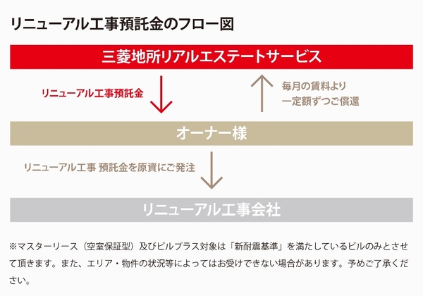 オーナー様ご所有ビルを一括賃借し、費用を立替負担して改修・リニューアルを行い、テナント企業様に転貸するサービス
