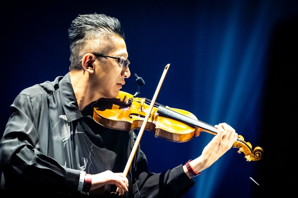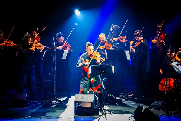 南スタンドに腰をおろすと、ステージが眼前に広がる。左右に置かれた巨大スクリーン、バックに掲げられた武田双雲の筆による「石田組」のロゴ、それに数え切れないほどの照明が仕込んであるようだ。武道館というハコに真っ向から挑むような舞台の構えに期待が一気に膨らむ。開演時刻になると客電が落ち、歓声が上がる。紫色の灯りの中に登場した出演者陣(組員)が低くイントロを刻み始める。「BATTLE WITHOUT HONOR OR HUMANITY」(布袋寅泰)だ。やおらステージ中央に後光が差すと、ゆっくりと石田泰尚が登場。組員は全員サングラスを着けている。のっけからこれほど歌舞くとは!呆気にとられている内に、コンサートは「天国への階段」(レッド・ツェッペリン)、「スターゲイザー」(レインボー)と70年代ハードロックのレパートリーが続く。そういえばこの日取り上げられたバンドは、後半のU.K.を除けば皆武道館でのライブを行なっている。「天国への階段」では照明の演出により教会でカンタータを聴いているような雰囲気を作っていく。ジミー・ペイジのあのギターソロは辻本玲(チェロ)、中村洋乃理(ヴィオラ)、佐久間聡一(第1ヴァイオリン)、双紙正哉(第2ヴァイオリン)のトップ奏者によるソロで繋ぐ。石田組は音楽を通して各メンバーにスポットを当てていくのが本当にうまい。「スターゲイザー」ではディストーションや太い音圧がPAを通してしっかりと響く。ケルト〜中東という流れに続いて、「亡き王女のためのパヴァーヌ」(ラヴェル)、「火祭りの踊り」(ファリャ)、「ファランドール」(ビゼー)と、クラシックナンバーを通じてエキゾチックな雰囲気が会場を覆う。「ファランドール」はこの日最初のピークを刻んだ。