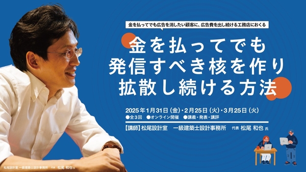 新建ハウジングでは、1月31日(金)からはじまる工務店ミライ塾『金を払ってでも発信すべき核を作り拡散し続ける方法』の事前説明会を12/4(水)13時からオンラインで開催いたします。
