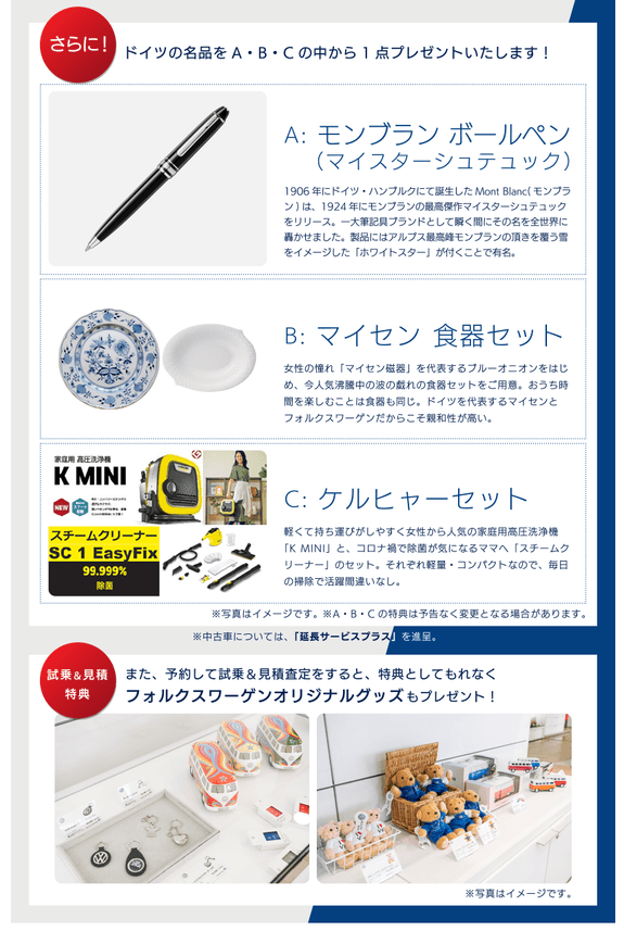 フォルクスワーゲン仙台北・仙台南限定のスペシャル価格(購入サポート30万円分)の特選車や大切な人を守ってくれる ドライブレコーダー(前・後)と ニューサービスプラス(3年間メンテナンスパック)、さらにマイセンやケルヒャー、モンブランなど、女性に喜んでいただけるドイツの名品など盛りだくさん。