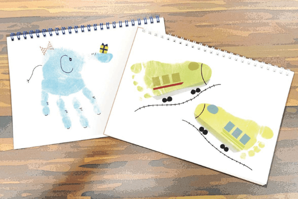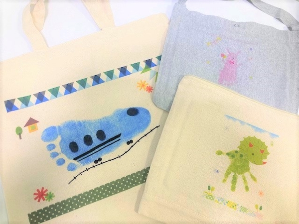 ①手足形アート体験 ②作った作品をカバン・ポーチにプリント体験 ③カレンダー作成
