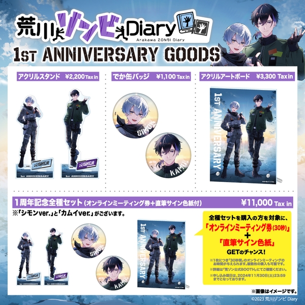 1周年記念グッズは、SHIBUYA TSUTAYA 6階IP書店、荒川ゾンビDiary公式BOOTHにて、2024年10月4日(金)10:00〜2024年11月7日(木)21:00の期間で発売となりますので、この機会にぜひお買い求めください!