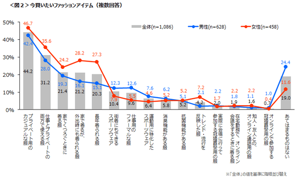 在宅時間が増えた影響か、家で着る服の需要が高めだが、女性にとっては“外出ができる”こともポイントになることが窺える。<図2>